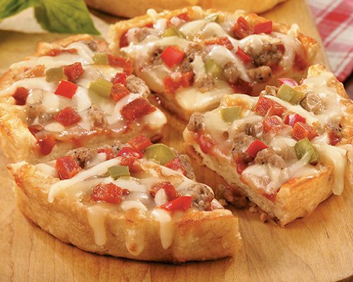 This popular 5-inch pizza is topped with the works and heats up perfectly in the microwave for work lunches or for after-school snacks. Great oven-baked for a sensational lunch or supper and served with a salad. Deep-dish crunch, covered in Pepperoni, Italian sausage, Mozzarella cheese, bell pepper and onion, these pizzas are a must-have favorite for on-the-go families. Individually wrapped.